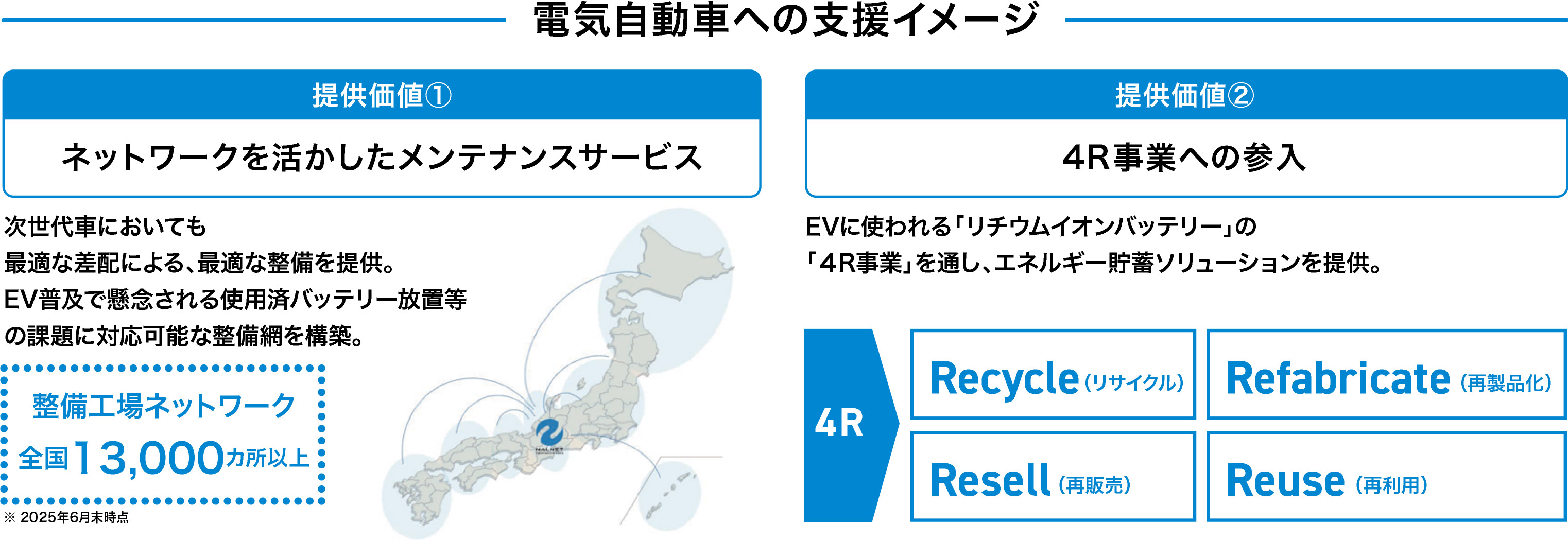 大手企業を中心に、サステナビリティ•ESGの観点から社用車等を電気自動車(EV)へ切り替える事例が増加しています。そうした流れを受け、次世代リース車の導入支援やメンテナンス体制を整備し、特に長期使用を見据えたアフターサービス網の構築、ゼロエミッションへの貢献にも注力します。EV、FCV(水素自動車)、先進運転支援システムやコネクテッドカー分野のメンテナンスもご相談ください。