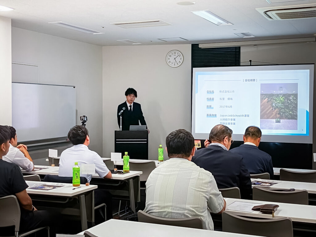 株式会社JJS(以下、JJS)代表取締役の松里優祐氏が登壇。外国人材採用をめぐる最新の動向を解説し、採用前後に必要な手続き、採用事例の紹介に加え、外国人材が整備工場に求めることや、定着を実現するための具体的なポイントを提示しました。