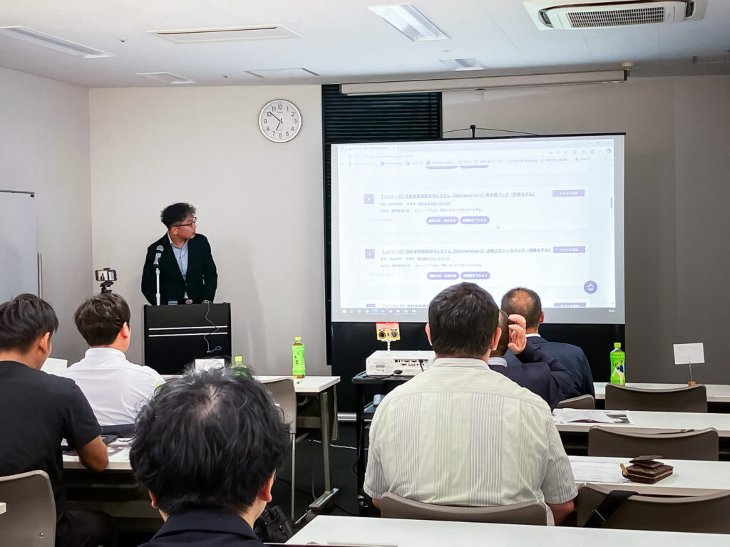 当社からはモビノワ事業室 部長の田中伸明が登壇し、「モビノワ経営サポート」における補助金活用支援の内容を紹介。現在整備工場が活用できる最新の補助金の詳細や、採択率を上げるポイントなどを解説しました。