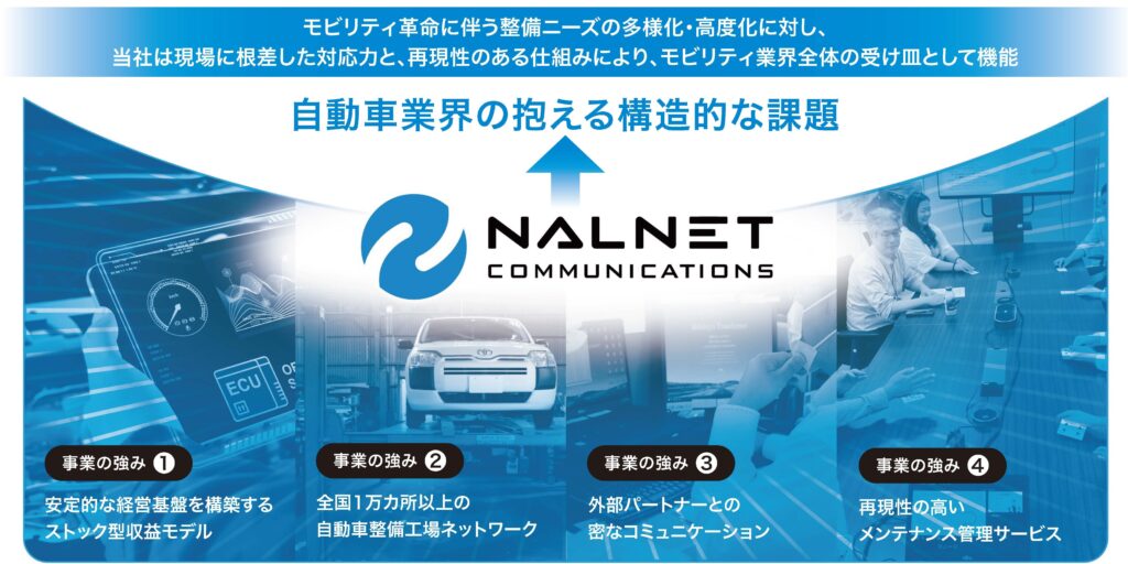 1978年に誕生したナルネットコミュニケーションズは、創業以来一貫してリース車両の管理を手掛け、自動車メンテナンスに関する膨大なデータを蓄積しています。近年は「モビリティ・インフラ カンパニー」を標榜し、EV等次世代車の登場による整備技術の変革、カーシェアリングをはじめとする販売・使用方法の多様化など、“100年に一度”と言われるモビリティ革命に対応するため、現場に根差した対応力と再現性のある仕組みを構築。今回展開する新車検プラットフォームを含め、自動車業界の抱える構造的な課題を解決すべく、今後も様々な新サービスを開発・展開していきます。